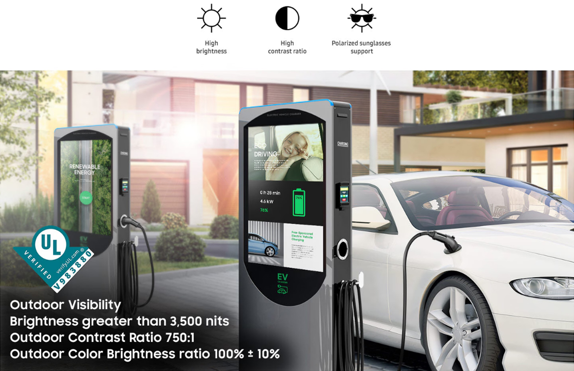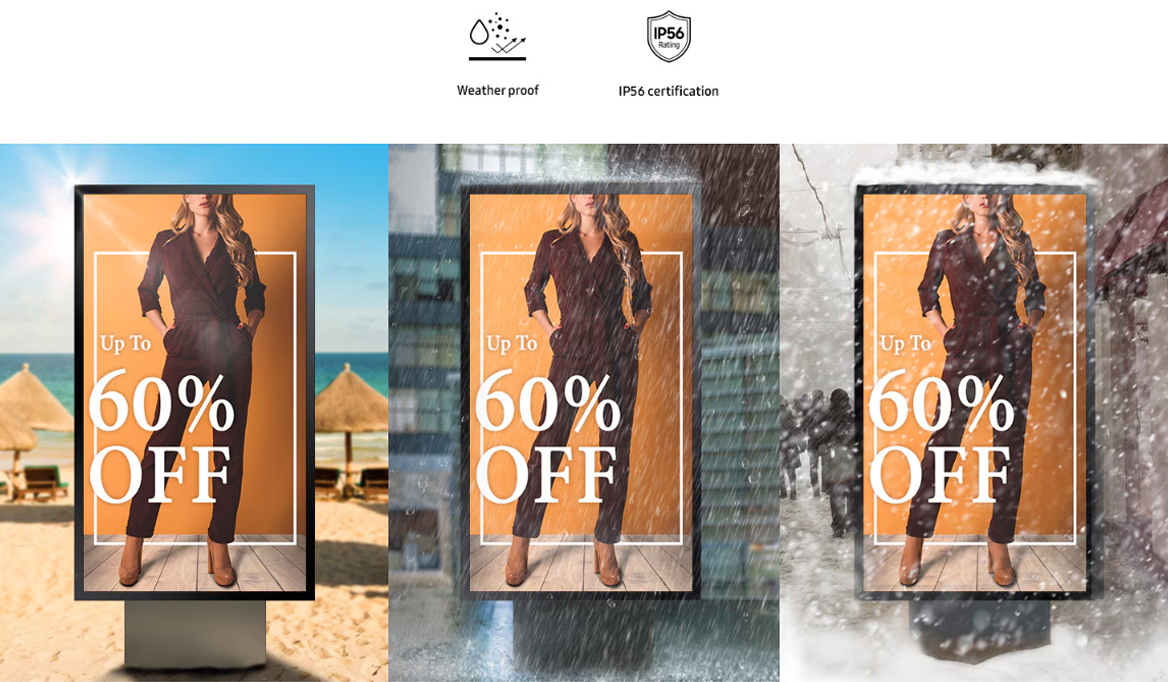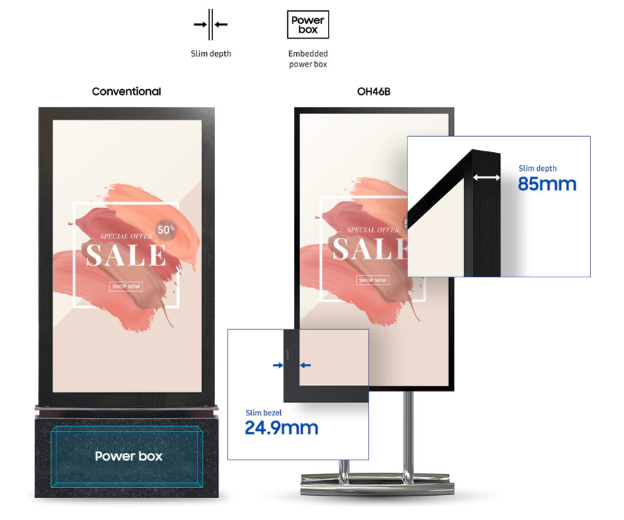 A slim, all-in-one composition enables easy installation, while long-term performance is ensured through IP56 protection, anti-reflection technology, damage defense and an efficient cooling system. Plus, an integrated power box condenses operational components and supports an ultra-slim frame.