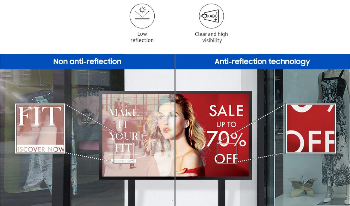 Samsung OH46B is enhanced by Magic Protection Glass, which utilizes advanced anti-reflection technology. This innovative solution ensures much better visibility when watching in broad daylight, with a significantly low total reflection rate, ensuring clearer images and text for every viewer.
